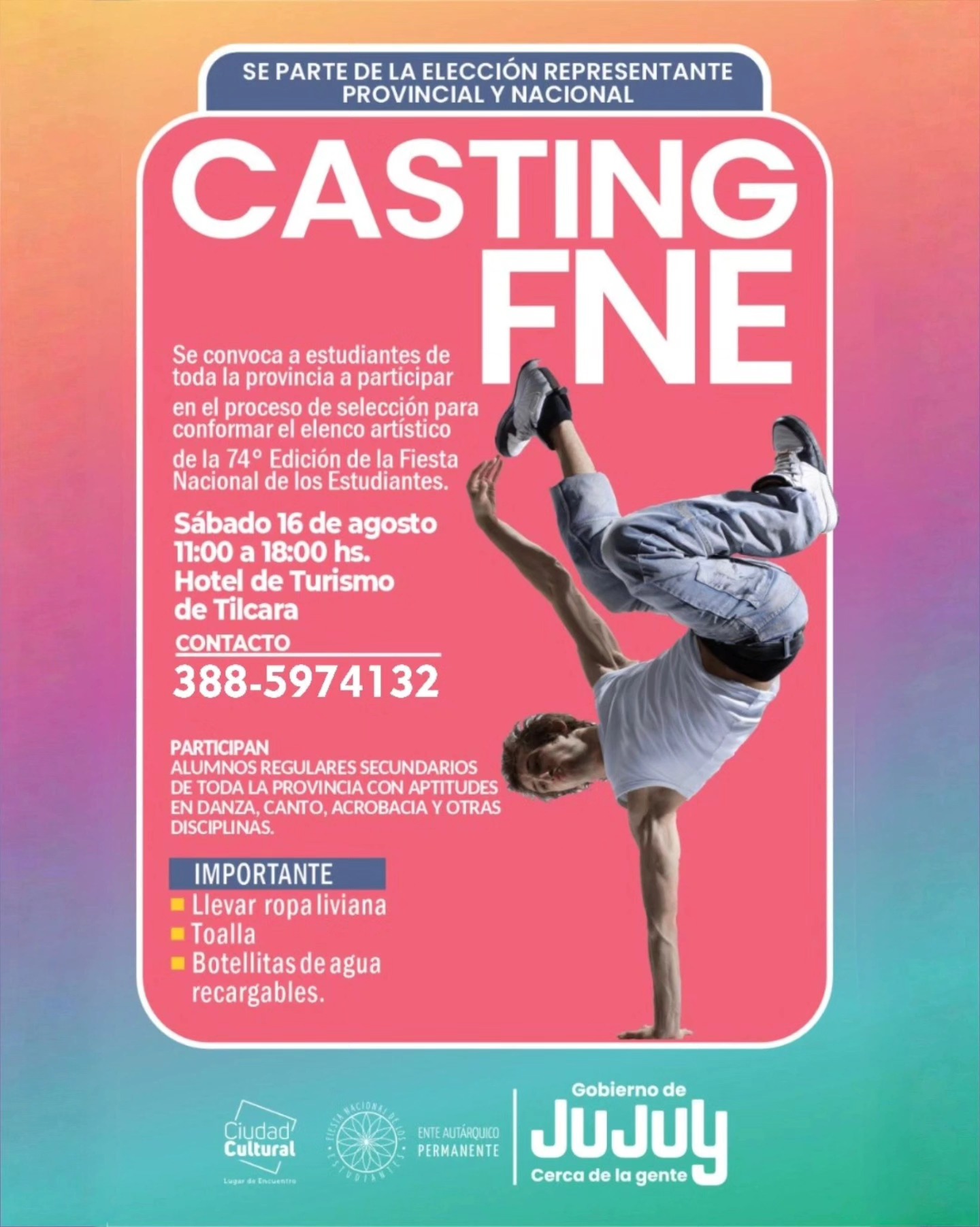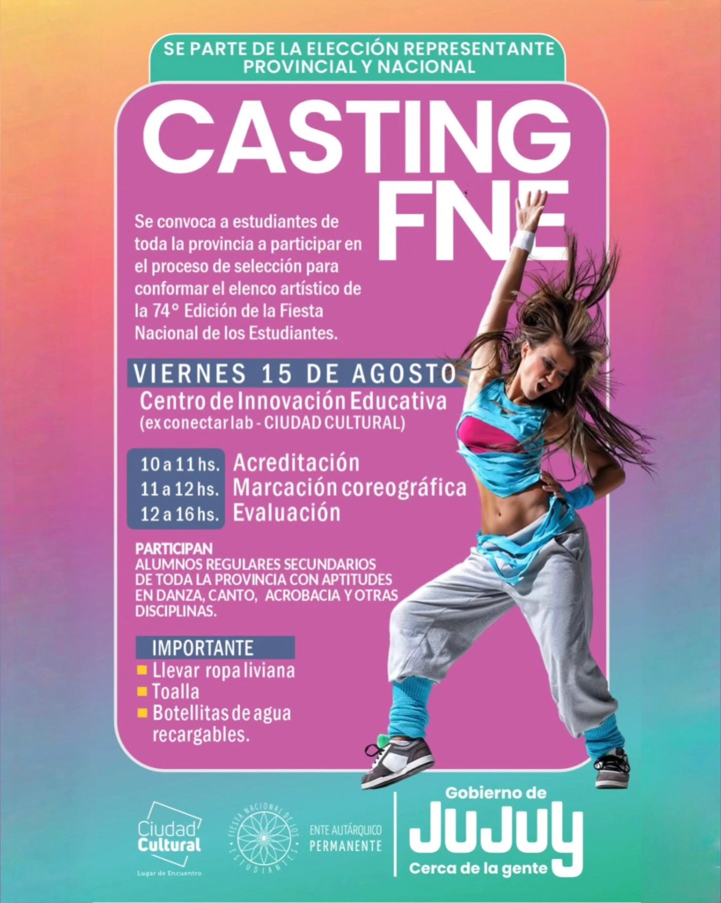 Previo a esos eventos, el fin de semana del 9 y 10 de agosto se desarrolló el tradicional Finde Estudiantil en el Estadio 23 de Agosto, con más de 60 colegios de toda la provincia participando en danzas, batucadas. Además, la organización confirmó que está en marcha el casting para seleccionar a las y los participantes de diferentes segmentos de la FNE, lo que permitirá que más jóvenes se sumen a los actos centrales.